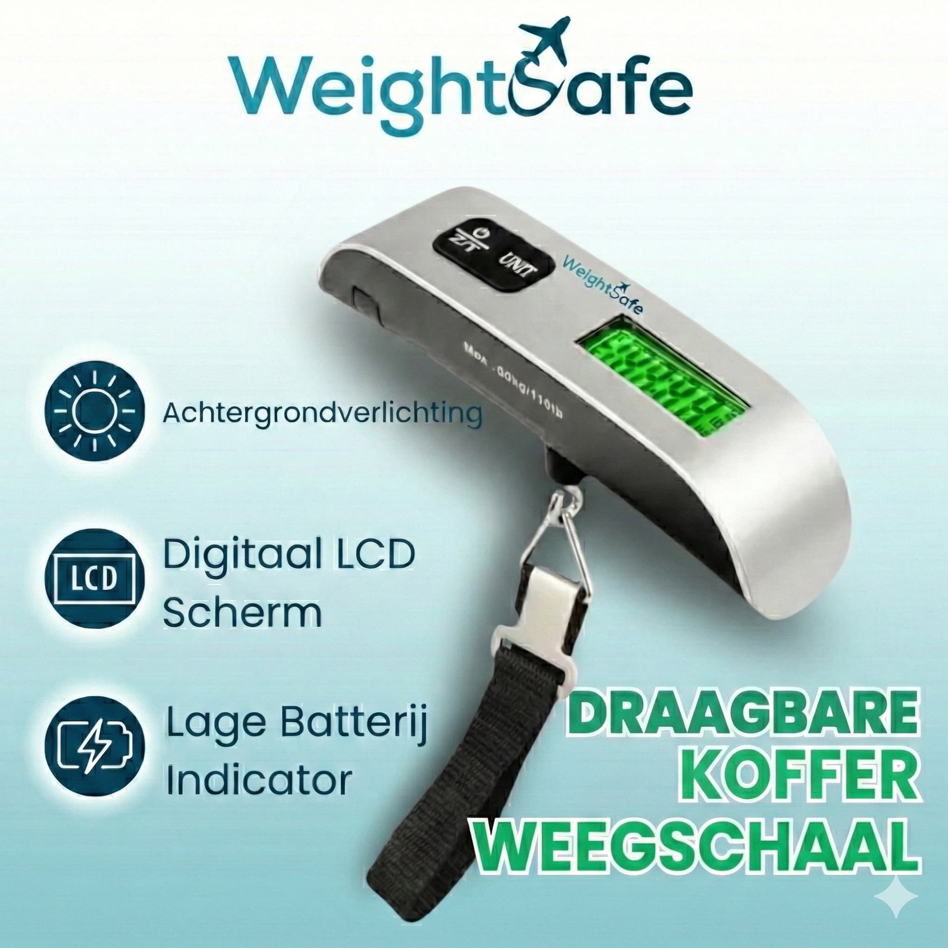 Integendeel. Met een gewicht van slechts 72 gram past de WeightSafe™ moeiteloos in je handbagage. Je neemt hem één keer mee — en gebruikt hem op elke reis opnieuw.