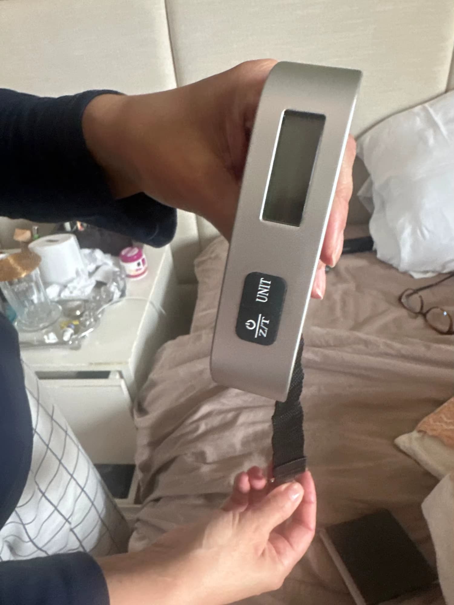 Geen probleem. Het heldere verlichte scherm zorgt ervoor dat je het gewicht altijd duidelijk ziet, ook in het donker of in een hotelkamer met weinig licht.